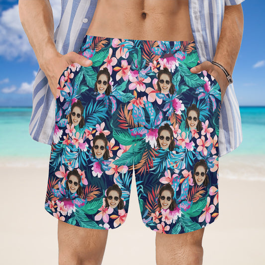 Custom Face Sea Flower Beach Shorts | Personalized Photo Men's Elastic Swim Trunks Vacation Party