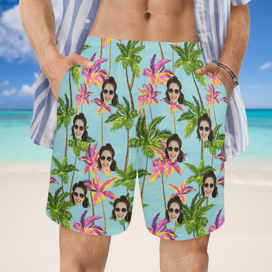 Custom Face Palm Leaves Beach Shorts | Personalized Photo Men's Elastic Swim Trunks For Husband