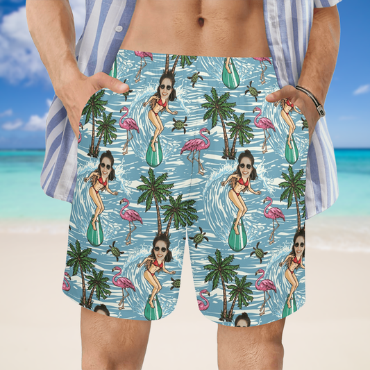 Custom Face Surfing Beach Shorts | Personalized Photo Men's Elastic Swim Trunks Prank Gift