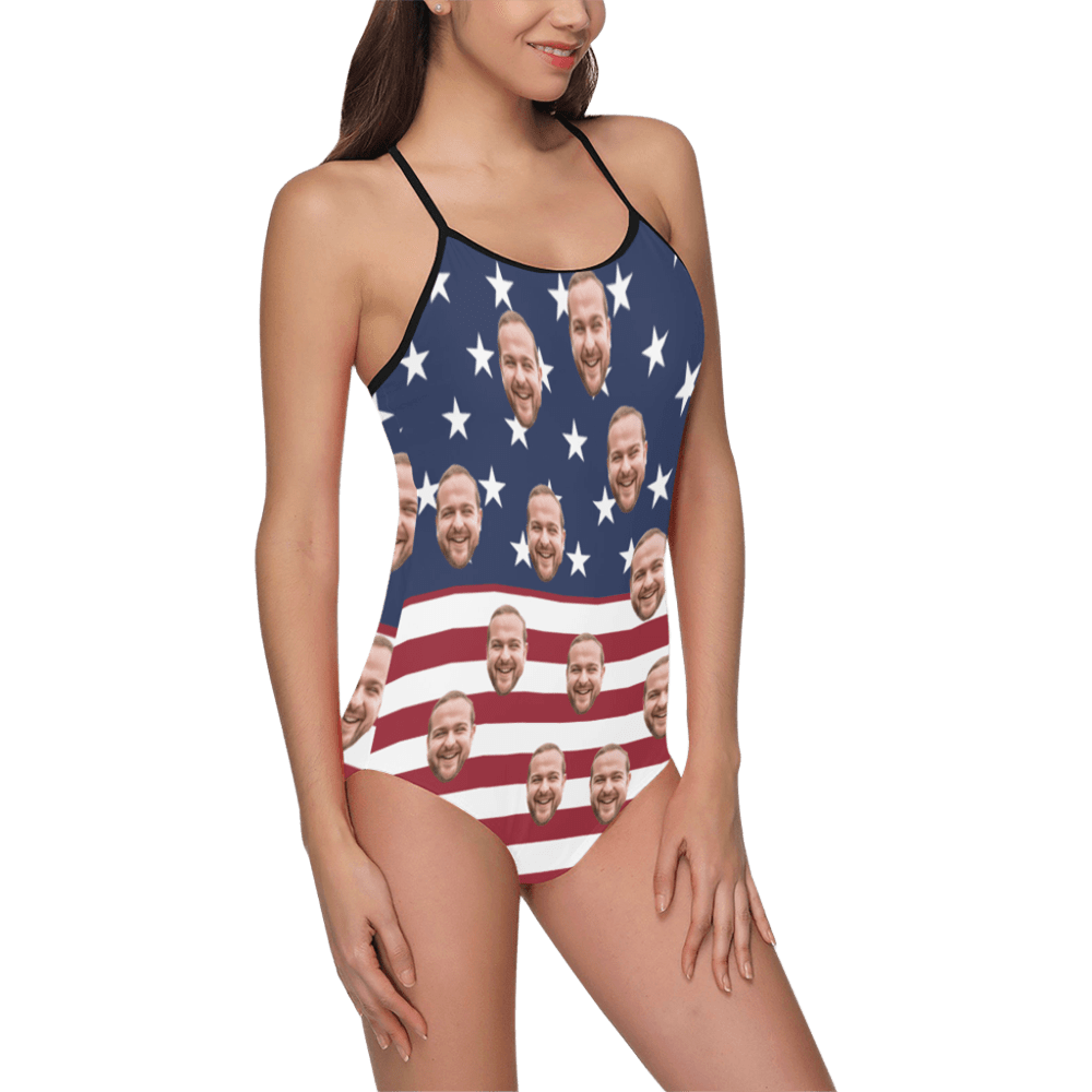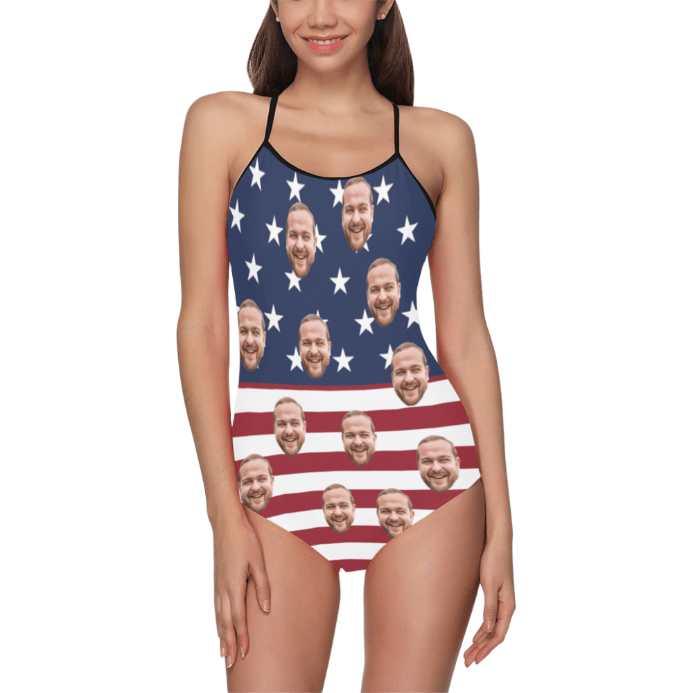 Custom Face American Flag Swimsuit | Personalized Women's Slip One-Piece Swimwear Holiday Party