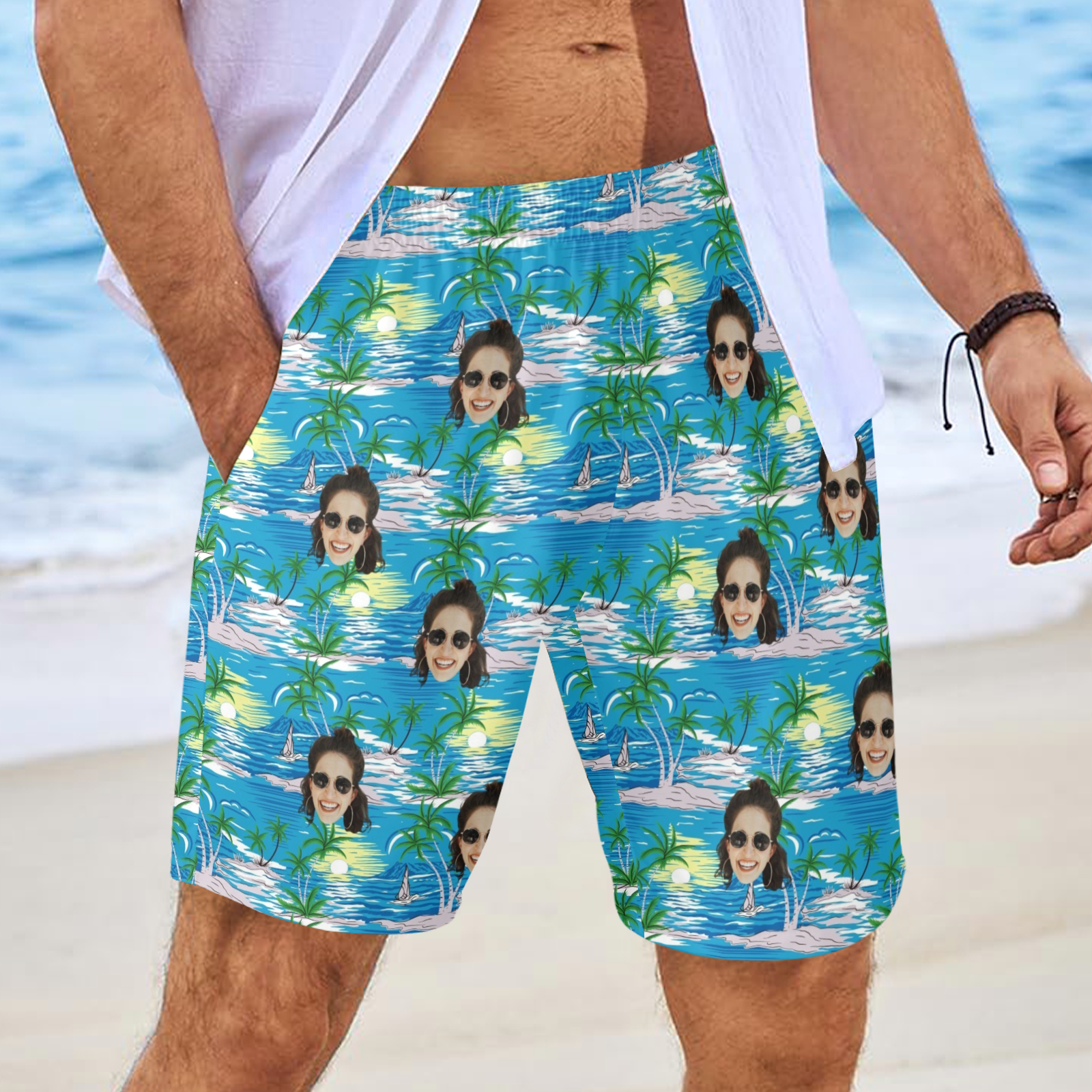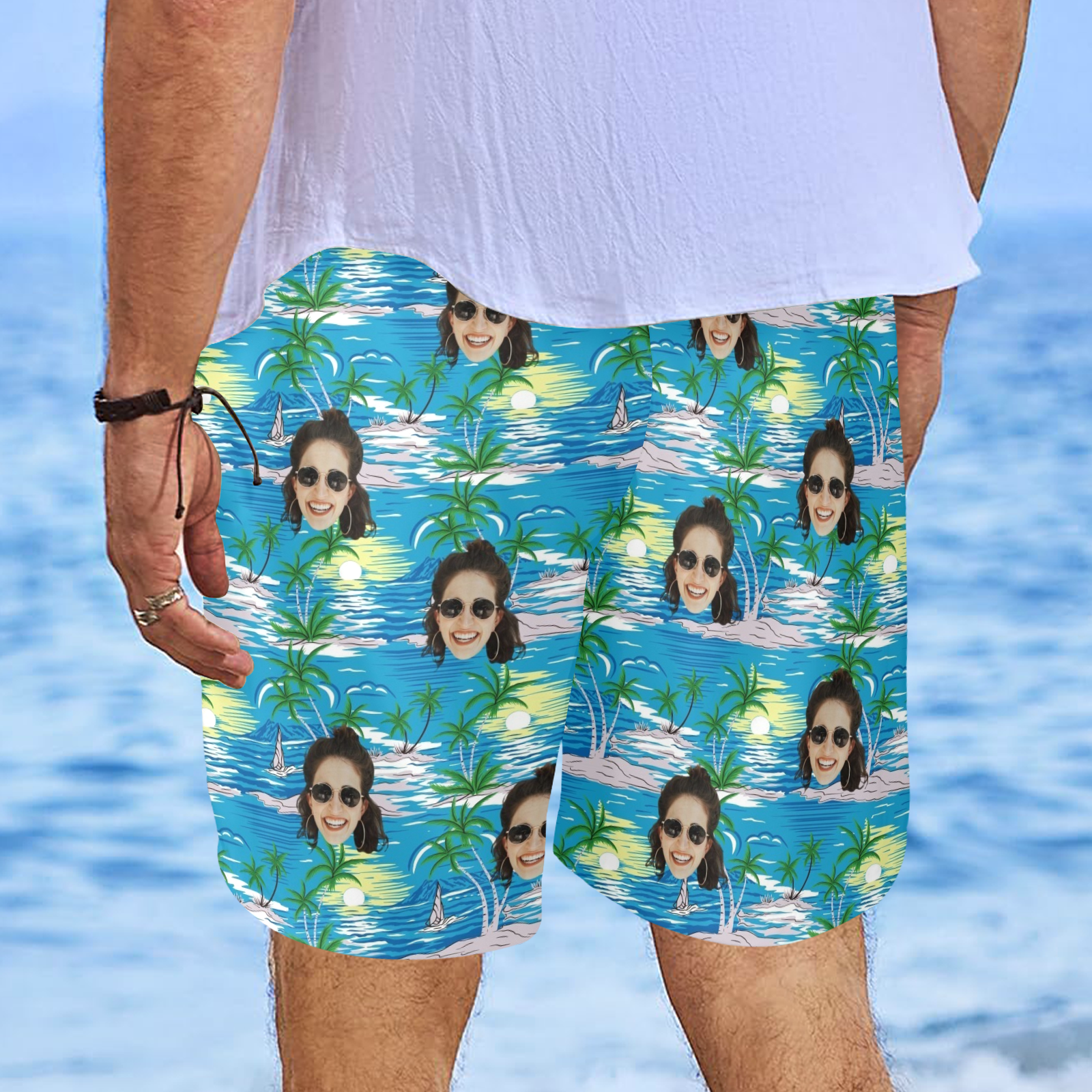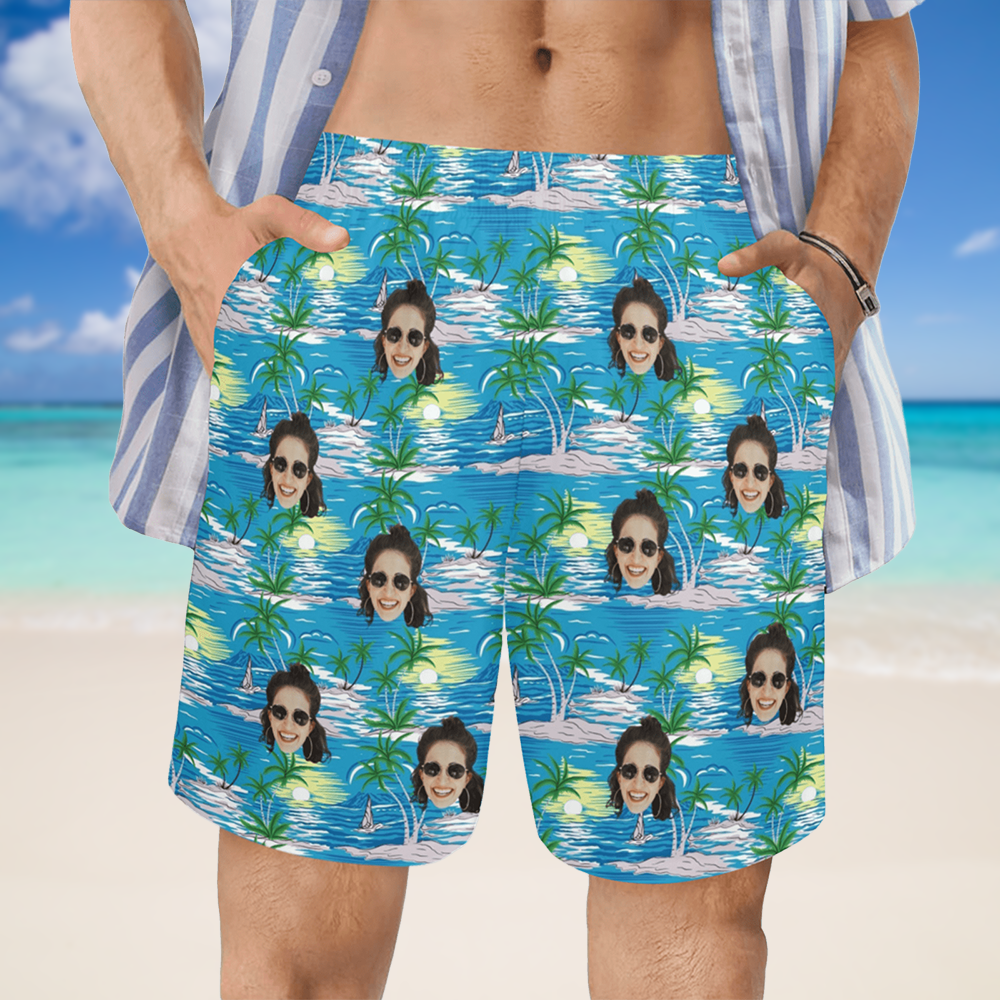 Custom Face Blue Sea And Island Beach Shorts | Personalized Photo Men's Elastic Swim Trunks For Husband