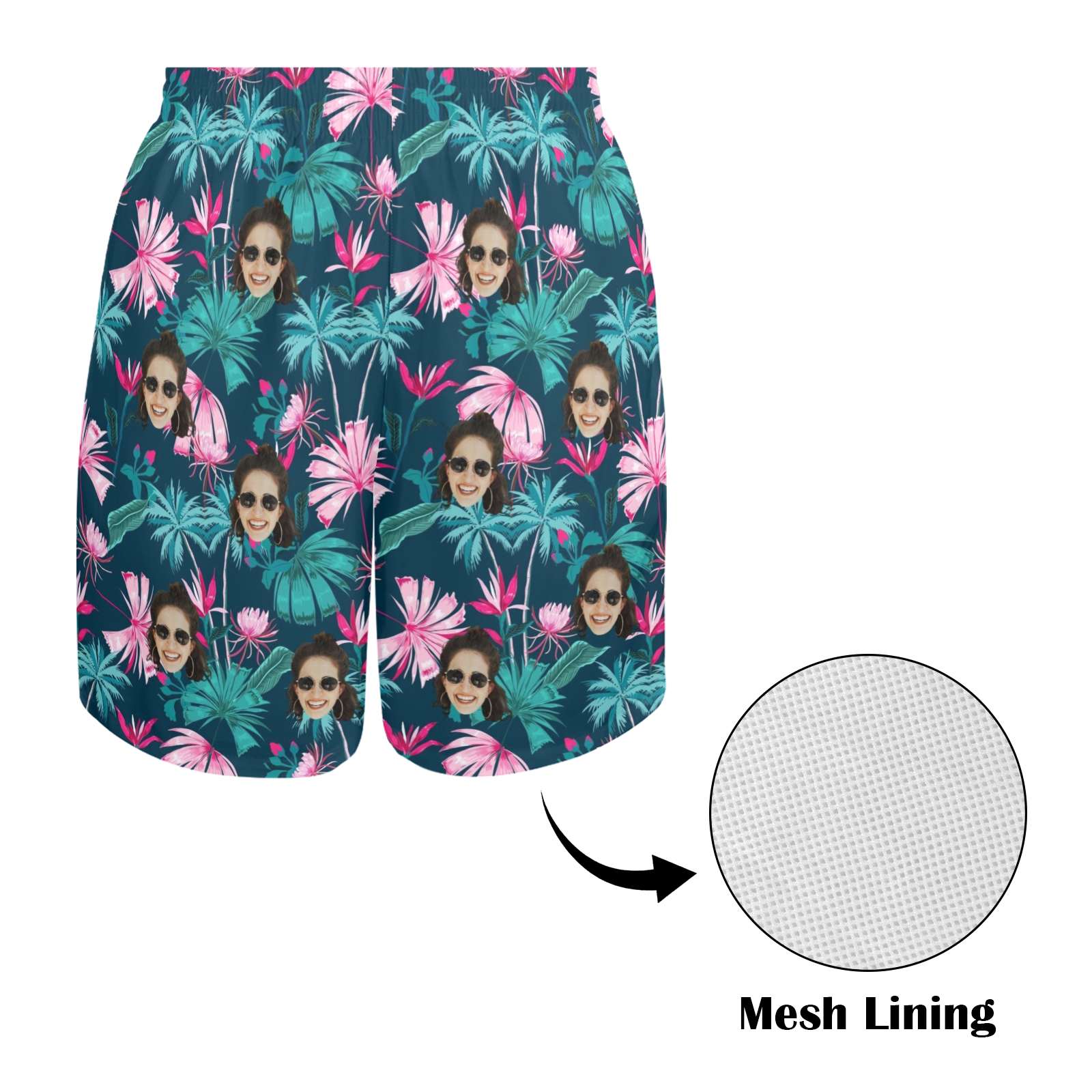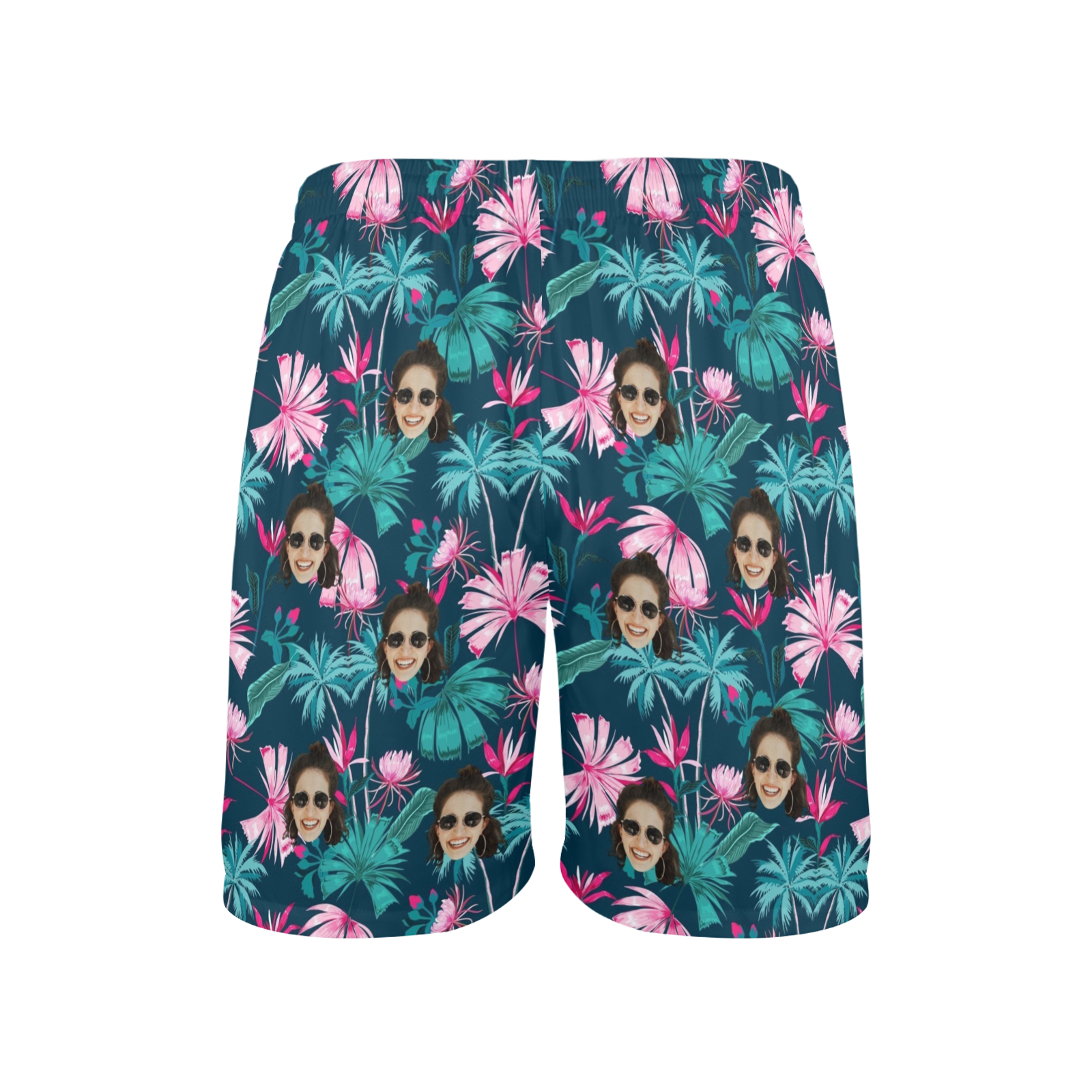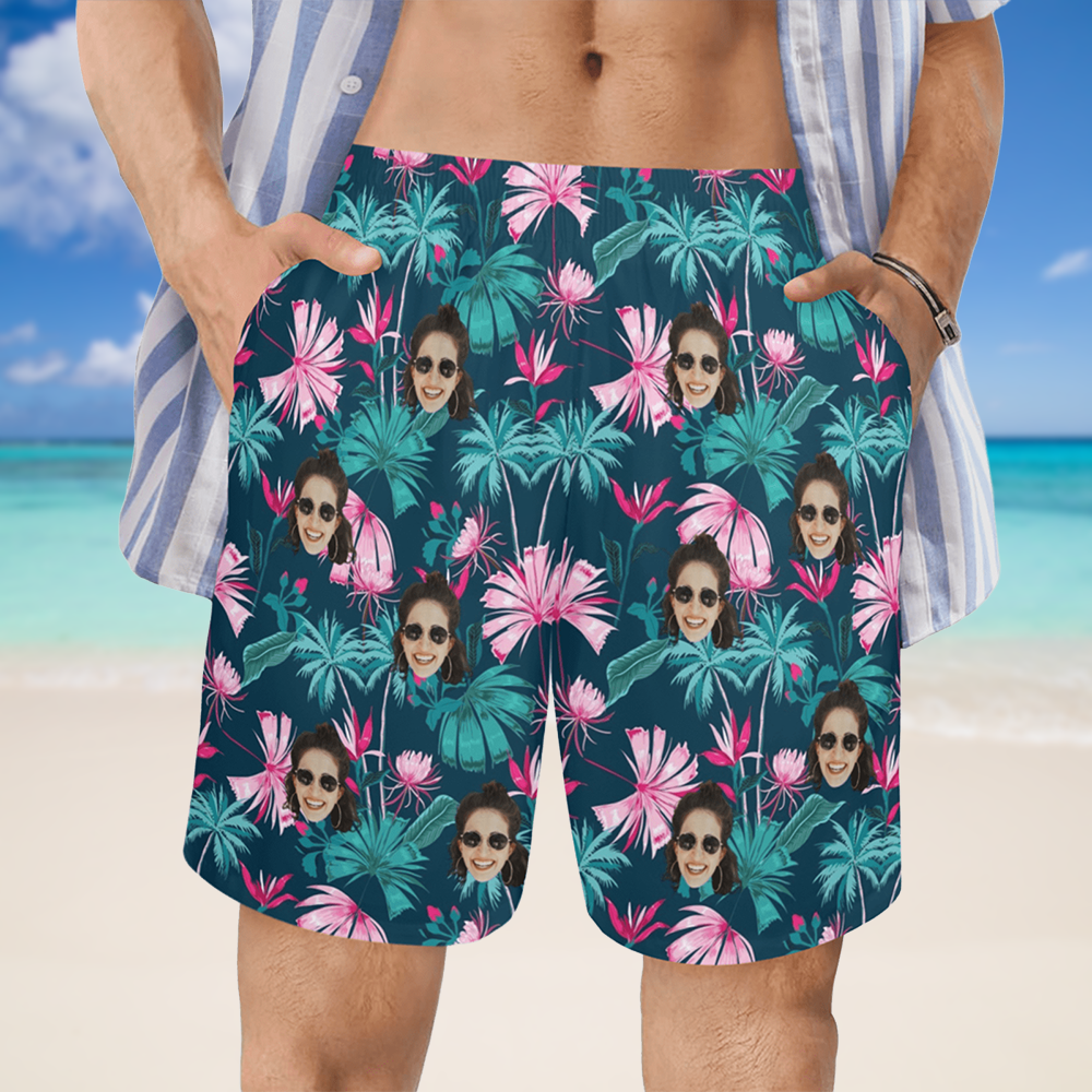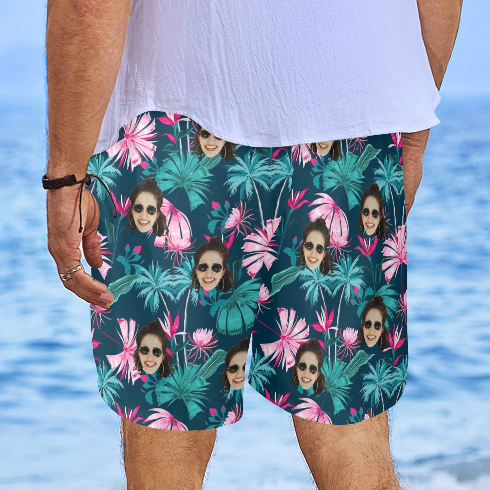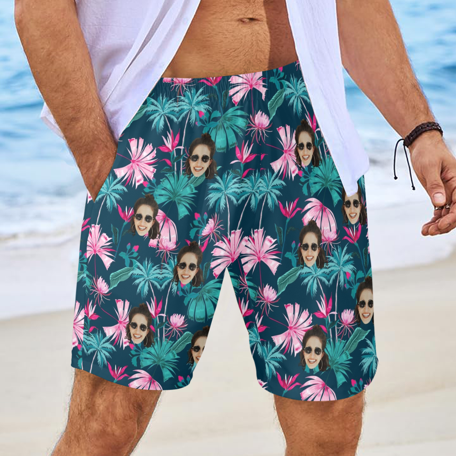 Custom Face Coconut Flowers Beach Shorts | Personalized Photo Men's Elastic Swim Trunks For Holiday