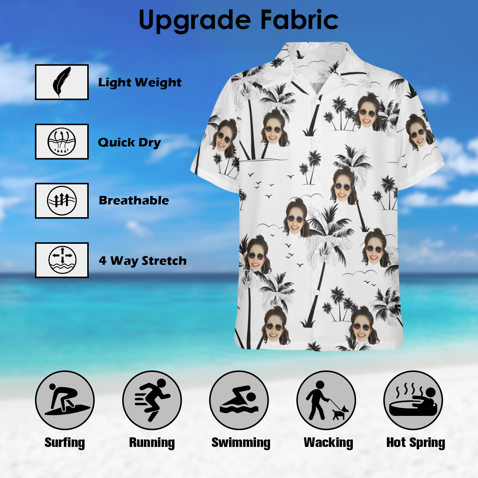 Make every tropical getaway unforgettable with our one-of-a-kind Custom Face Hawaiian Shirt! Crafted from 95% polyester + 5% spandex, this stretchy yet breathable fabric moves with you – perfect for dancing at tropical weddings, lounging on cruise ships, or adventuring through rainforests. Upload any face (or pet!) to create a hilarious vacation souvenir that’s as unique as your travel stories.