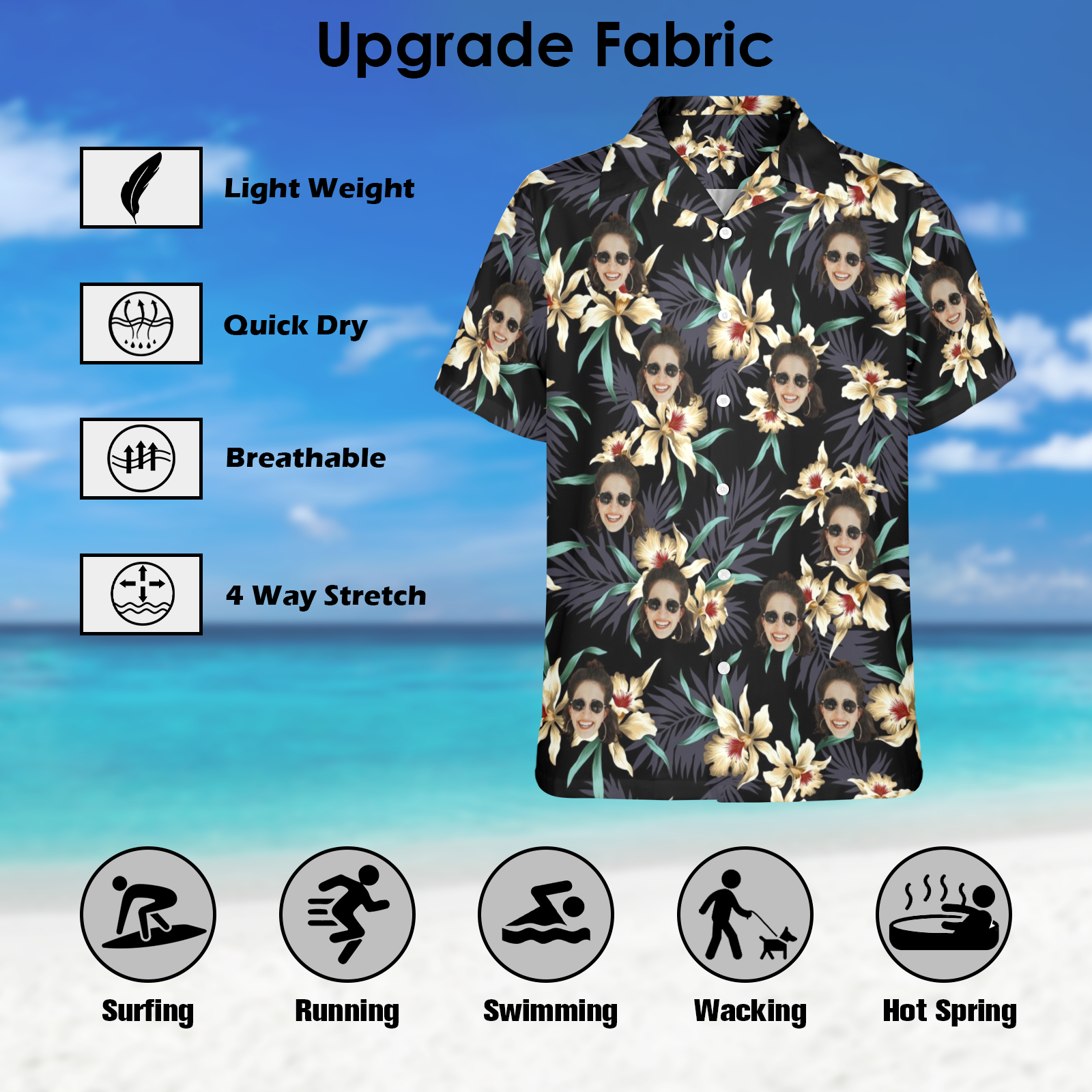 Make every tropical getaway unforgettable with our one-of-a-kind Custom Face Hawaiian Shirt! Crafted from 95% polyester + 5% spandex, this stretchy yet breathable fabric moves with you – perfect for dancing at tropical weddings, lounging on cruise ships, or adventuring through rainforests. Upload any face (or pet!) to create a hilarious vacation souvenir that’s as unique as your travel stories.