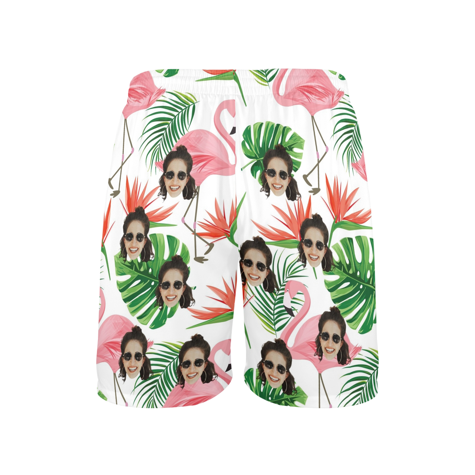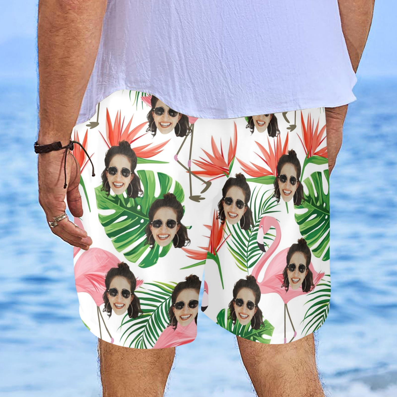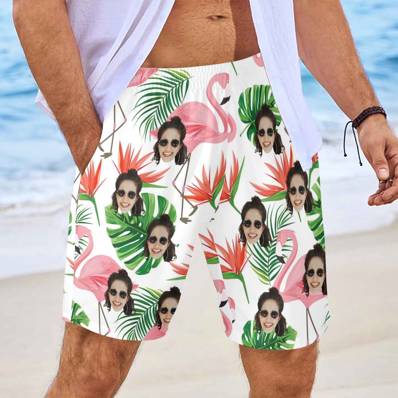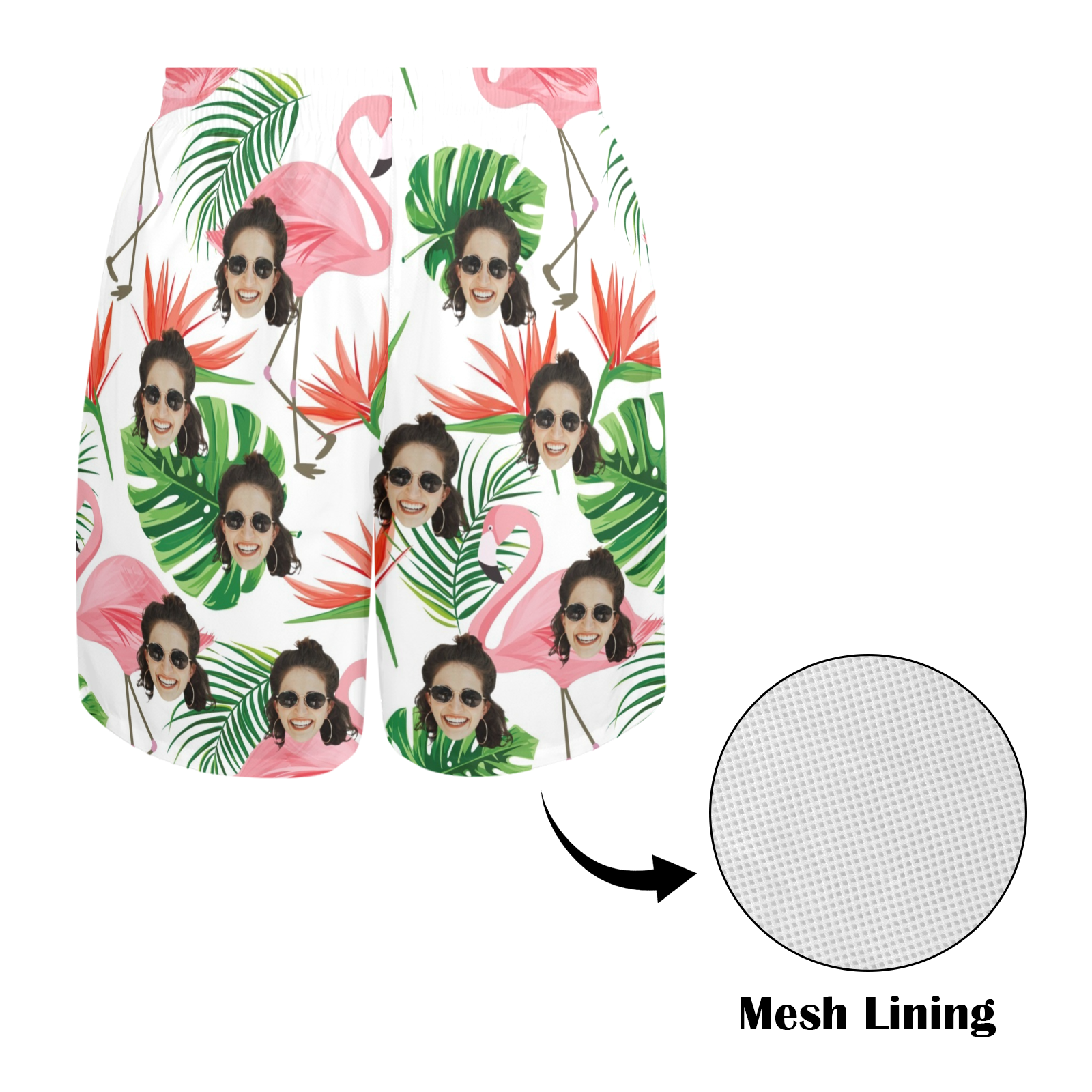 Custom Face Pink Flamingo Beach Shorts | Personalized Photo Men's Elastic Swim Trunks For Cruise