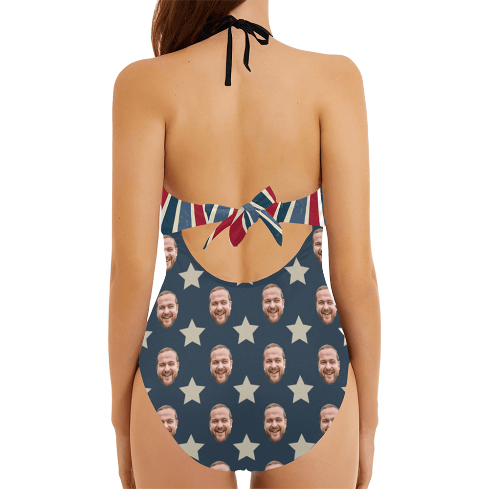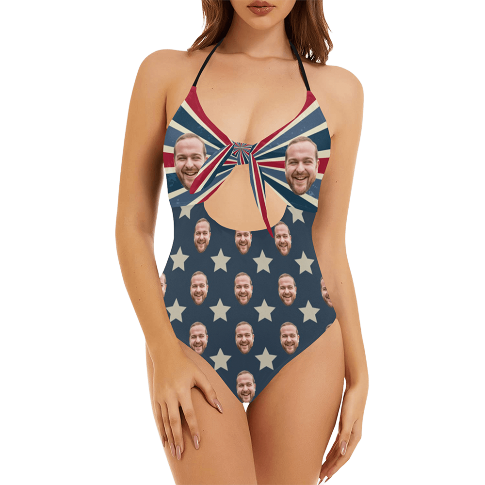 Custom Face Retro Flag Swimsuit | Personalized Women's Backless Bow One Piece Bathing Suit