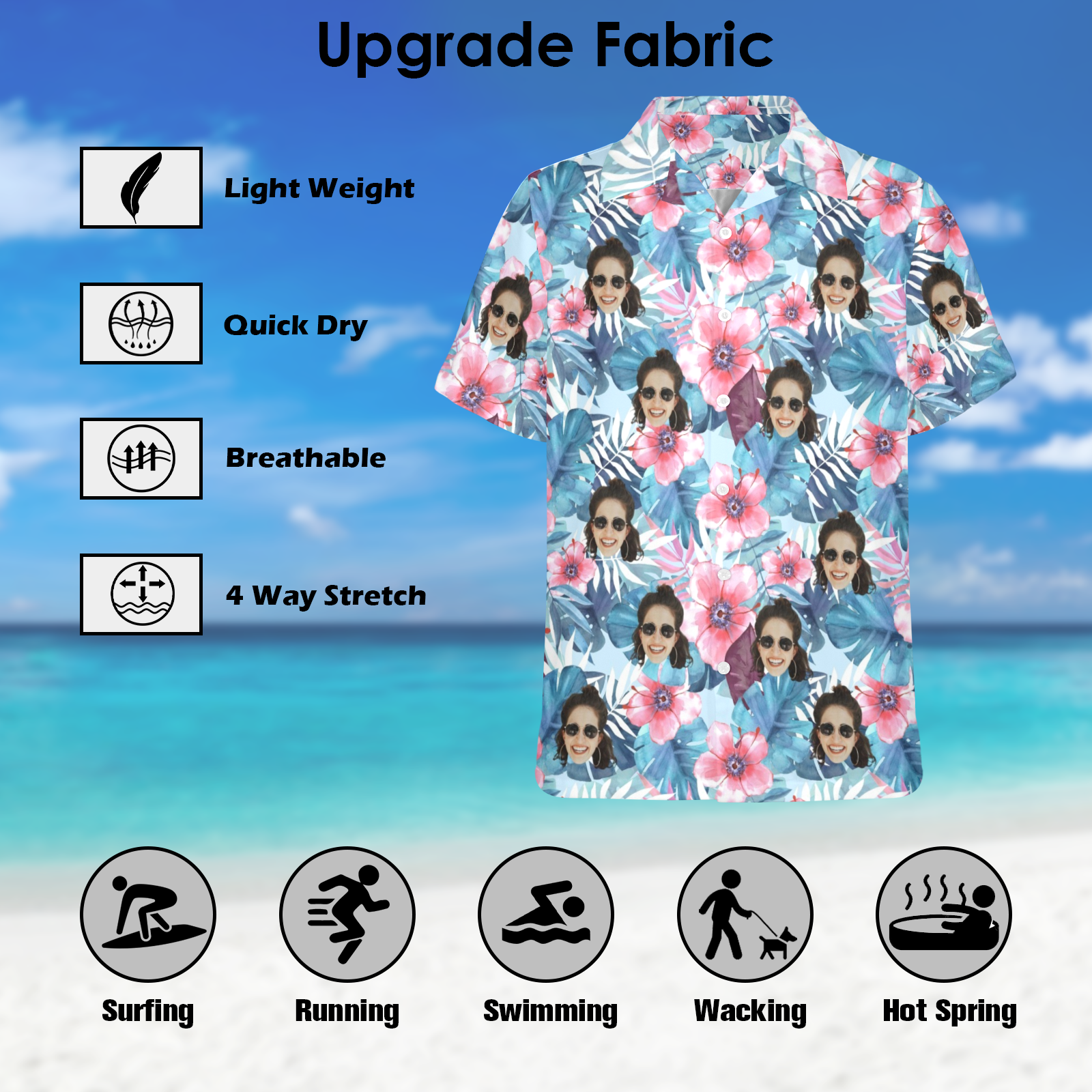 Make every tropical getaway unforgettable with our one-of-a-kind Custom Face Hawaiian Shirt! Crafted from 95% polyester + 5% spandex, this stretchy yet breathable fabric moves with you – perfect for dancing at tropical weddings, lounging on cruise ships, or adventuring through rainforests. Upload any face (or pet!) to create a hilarious vacation souvenir that’s as unique as your travel stories.