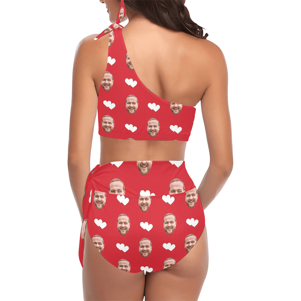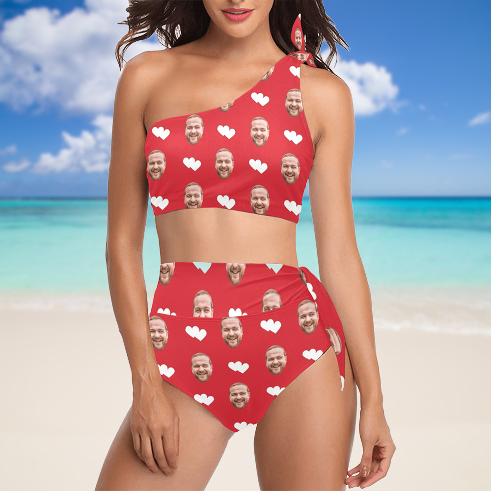 Custom Heart Face Red Swimsuit | Personalized Women's High Waisted One Shoulder Bikini Set For Cruise Trip
