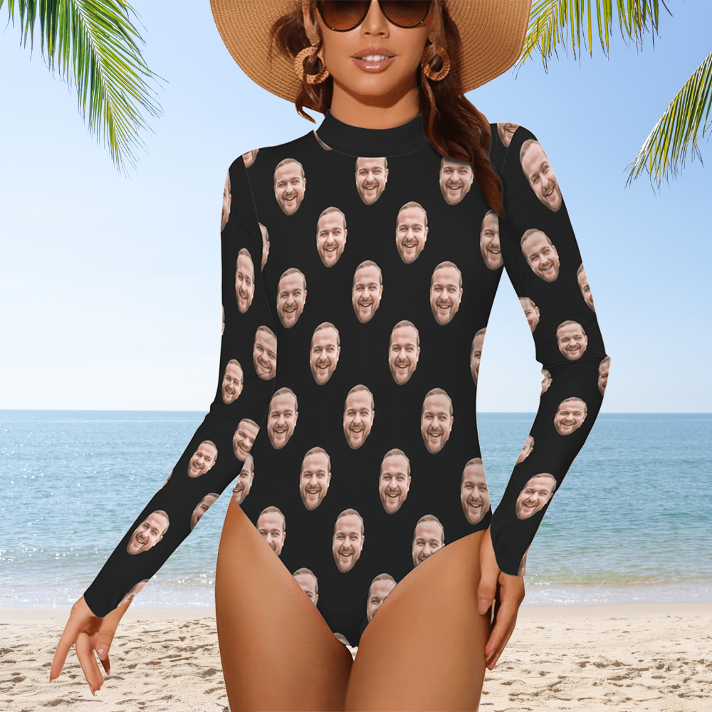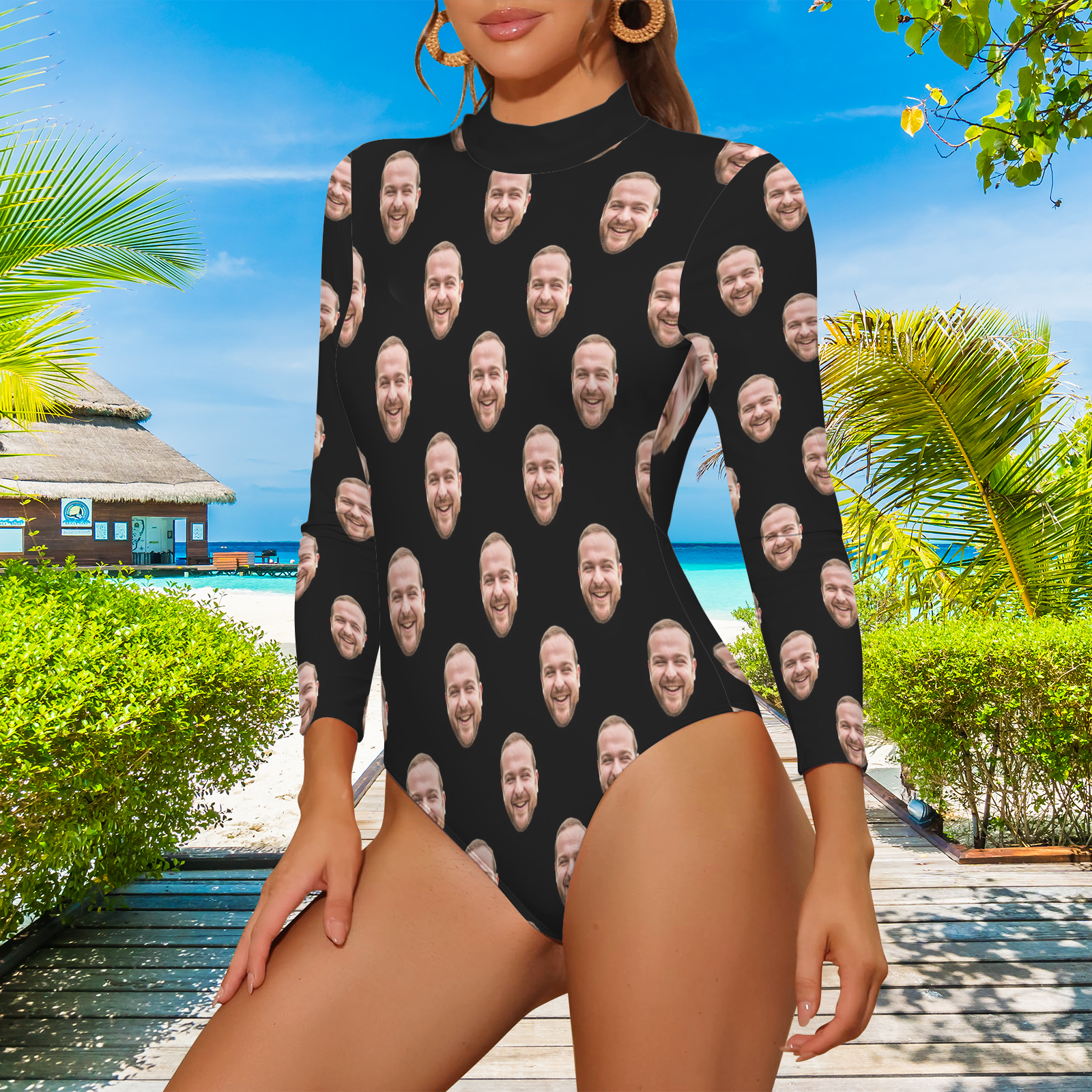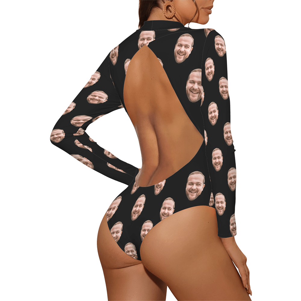 Custom Husband/Boyfriend Face Swimsuit | Personalized Women's Backless Long Sleeve One-Piece Bathing Suit For Honeymoons