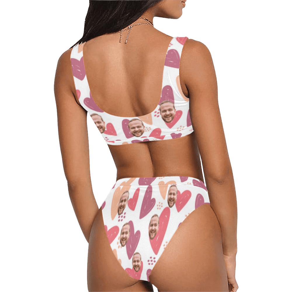 Custom Multi Heart Face Swimsuit | Unique Women's Scoop Neck Sport Top High Waisted Bikini Beach Outfits