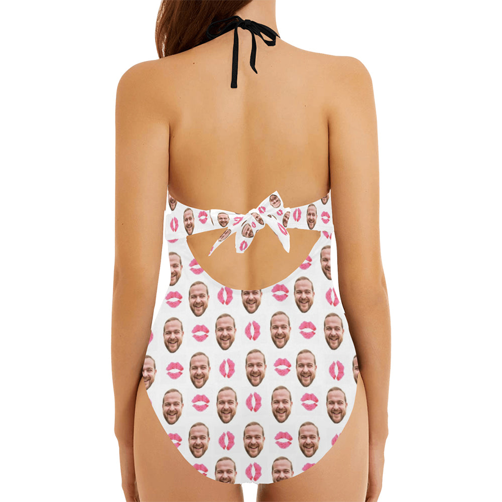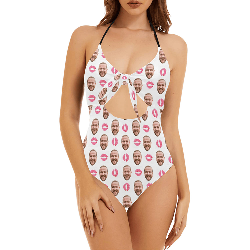 Custom Pink Lip Face Swimsuit | Personalized Women's Backless Bow One Piece Bathing Suit Birthday Gift