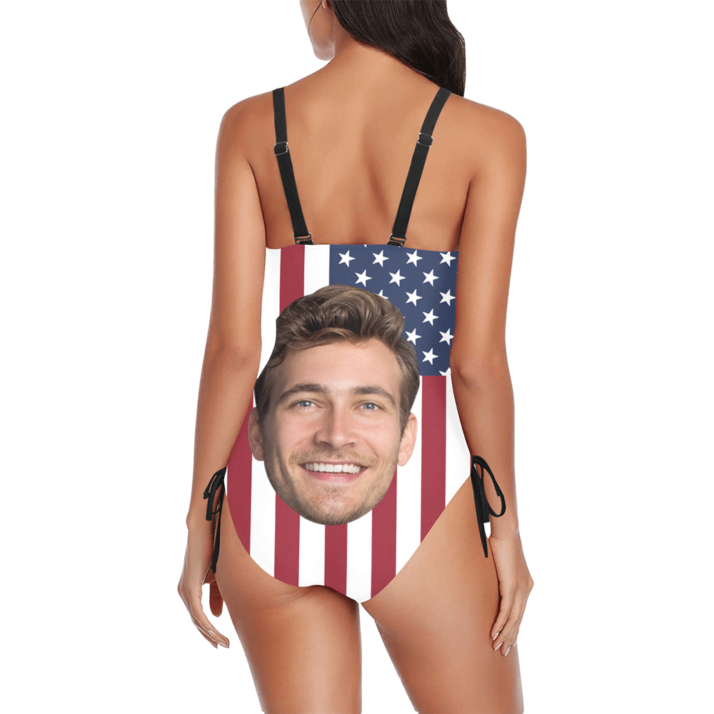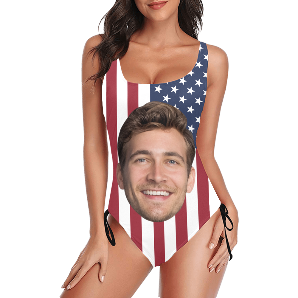 Custom USA Flag Face Swimsuit | Unique Women's New Drawstring Side One Piece Swimwear 4th Of July